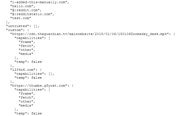 From the hierarchy of the file “untrusted” and “custom” are siblings, do do not look at the MP4 as being a child of “untrusted”. “gfycat.com” was also used to test embedded media, except this time, I pressed the second radio button on the pop-up and enabled media across the site.