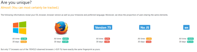 The bottom line tells me that my fingerprint is unique across almost 2 million browser fingerprints. This means that beyond reasonable doubt this site can uniquely identify me.
