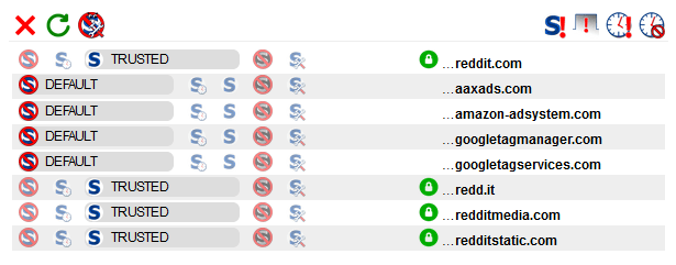 The site “test.com” was added manually from this screen. The padlock icon is “match HTTPS only” and the only time I could make it appear this way was by manually adding it via this web interface. When the padlock is red this means that the permissions do not apply when HTTPS is in use. I would recommend reading the NoScript forums for more details on this feature if it is critical to your investigation.